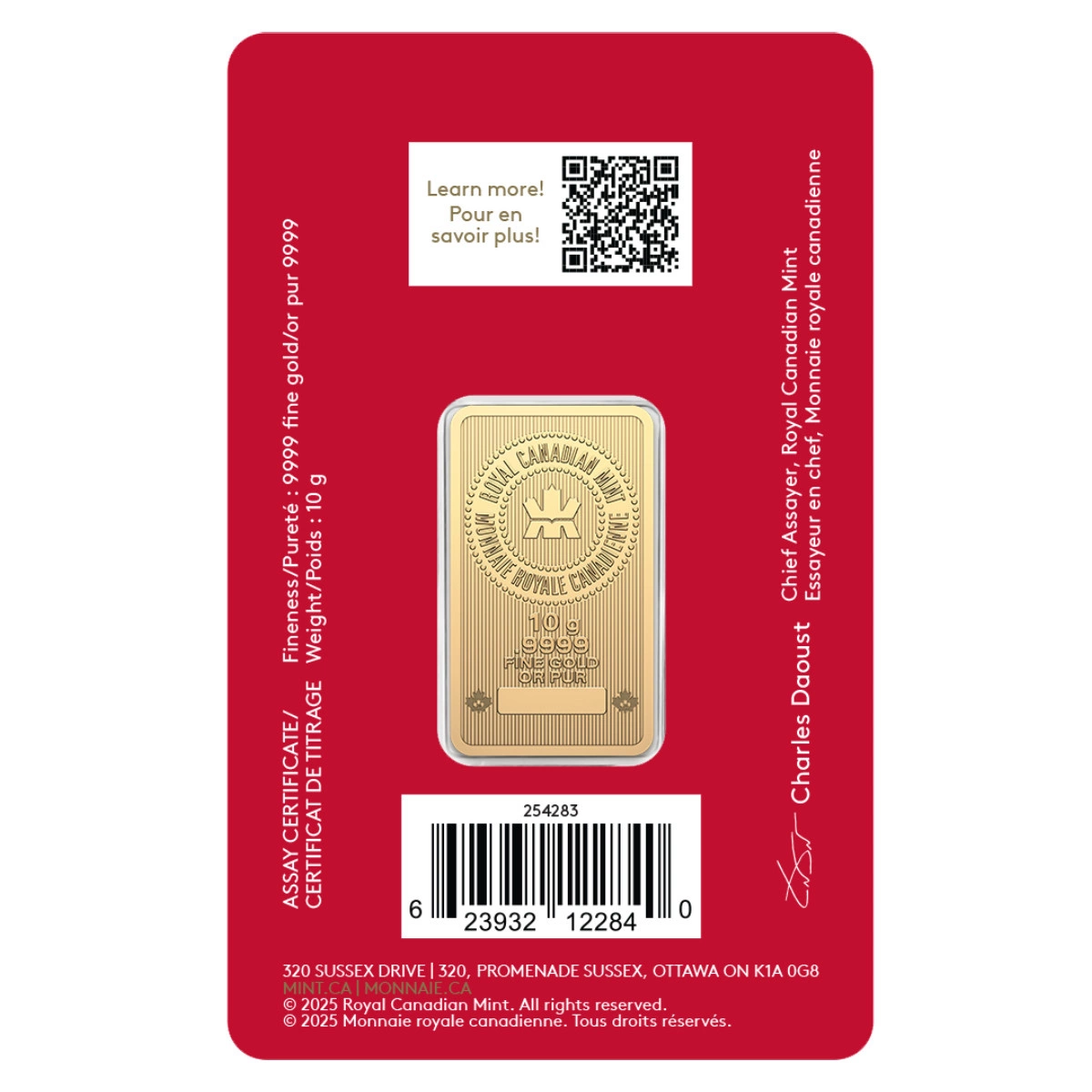 Rewers ukazuje logo Royal Canadian Mint oraz informacje o wadze i czystości złota, co potwierdza autentyczność i wysoką jakość produktu.