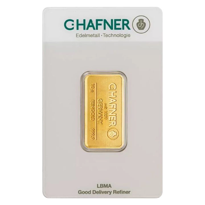 Sztabka o masie 10 g i próbie 999,9 zawiera 99,99% czystego złota. Awers zdobi grawer z logo C.HAFNER, precyzyjne oznaczenie próby oraz indywidualny numer seryjny, który umożliwia jednoznaczną identyfikację. Rewers został pozostawiony w gładkiej formie, co akcentuje minimalistyczny charakter produktu i ułatwia łączenie sztabek w zestawy inwestycyjne.