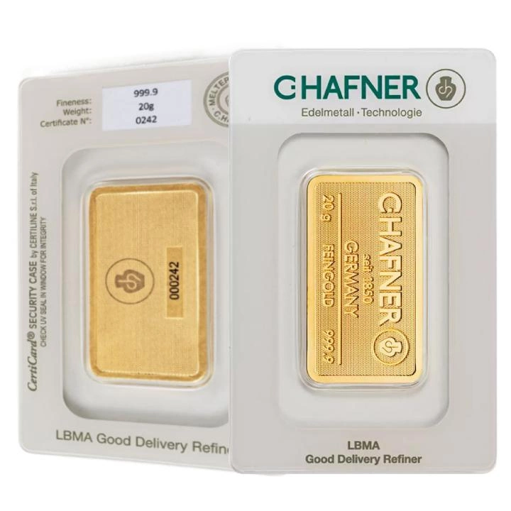 Sztabka o masie 20 g przy próbie 999,9 zawiera 99,99% czystego złota. Na awersie umieszczono estetyczny grawer z logo C.HAFNER, oznaczenie próby oraz indywidualny numer seryjny, umożliwiające jednoznaczną identyfikację produktu.