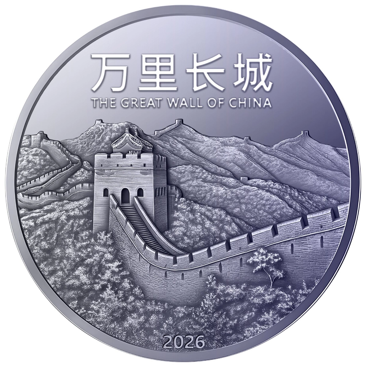 Rewers: wizerunek Wielkiego Muru Chińskiego wraz z rokiem emisji 2026, symbolizujący siłę, wytrwałość i dziedzictwo historyczne Chin.