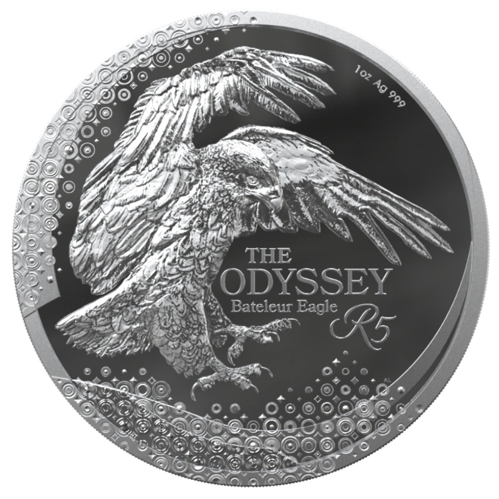 Rewers ukazuje majestatyczny obraz przedstawiający orła bateleur w locie, z rozpostartymi skrzydłami i szczegółowo odwzorowanym upierzeniem. Wokół umieszczono nazwę serii "The Odyssey Of The Sky" oraz wartość nominalną monety – 5 randów. Projektanci South African Mint zadbali o każdy detal, dzięki czemu kompozycja rewersu zachwyca zarówno artystycznie, jak i technicznie, podkreślając wyjątkowość tej monety inwestycyjnej.