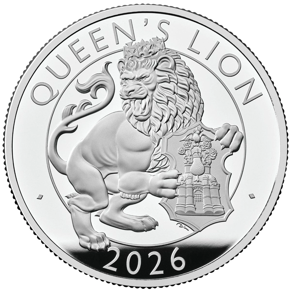 Rewers: Lew Królowej, dumny i potężny symbol, podtrzymujący tarczę z królewską odznaką Jane Seymour, symbolizującą jej pozycję i dziedzictwo Tudorów. Nad lwem znajduje się napis „QUEEN'S LION”, a poniżej rok emisji monety – 2026.