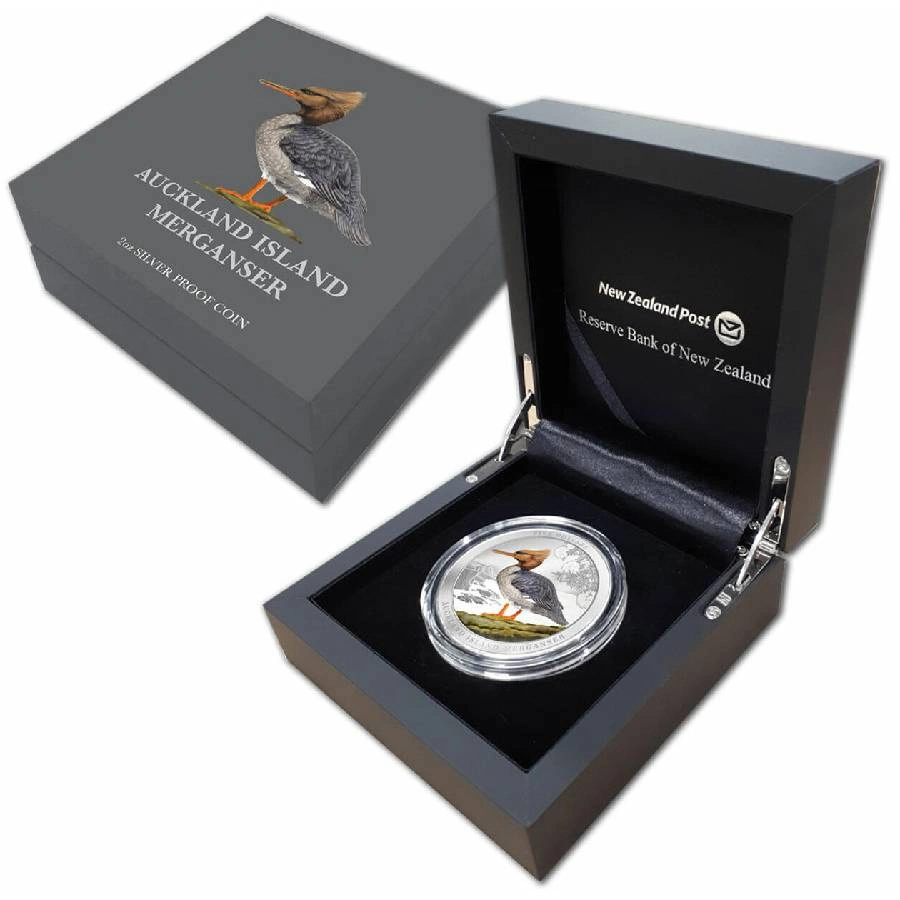 Limitowana moneta Tracz nowozelandzki kolorowany 2 uncje Srebra 2021 Proof to egzemplarz przedstawiający wymarłego już, rybożernego ptaka wodnego, który niegdyś zamieszkiwał Nową Zelandię. Gatunek ten, znany jako Mergus australis, został po raz pierwszy opisany w 1840 roku.