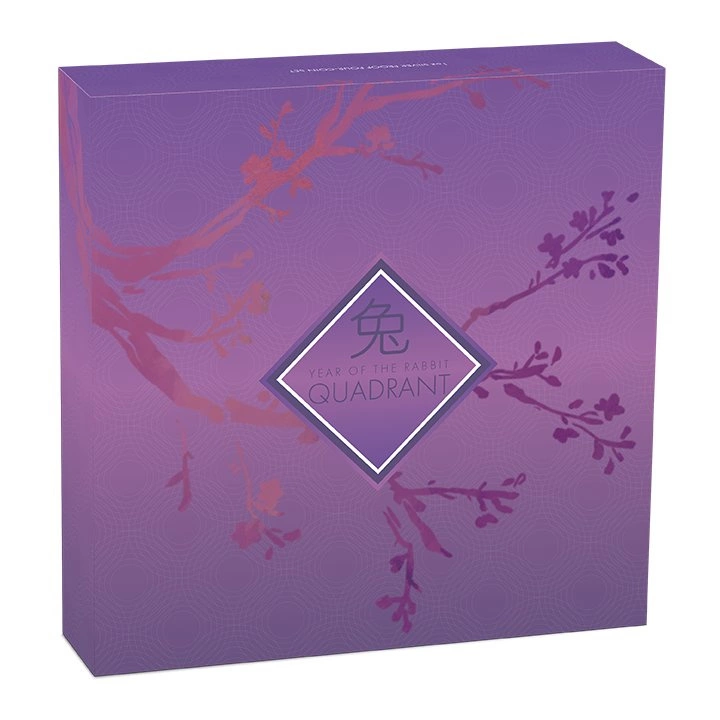 Zestaw 4 monet Tuvalu: Rok Królika Quadrant kolorowany 4 x 1 uncja Srebra 2023 Proof to kolekcjonersko-inwestycyjny produkt, który ukazuje kolorowane króliki.