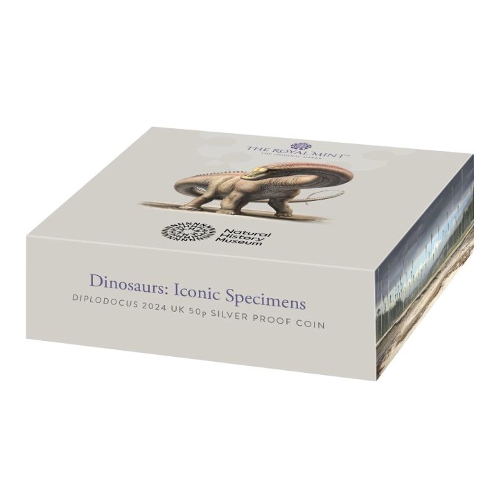 Dinosauři: Ikonické exempláře - Diplodocus 50p Silver 2024 Proof je třetí mincí ze série „Dinosauři: Ikonické exempláře“. Diplodocus je dinosaurus ze skupiny sauropodů, který žil v pozdní juře, přibližně před 154-152 miliony let, na území dnešní Severní Ameriky. Byl to jeden z nejdelších dinosaurů, dosahoval délky 21 až 27 metrů a hmotnosti 10 až 16 tun. Vyznačoval se dlouhým, ohebným krkem a dlouhým ocasem. Diplodok byl býložravec, který se živil hlavně nízkými rostlinami a pomocí dlouhého krku dosahoval na listy a jehličí. Jeho pozůstatky byly objeveny ve Spojených státech včetně Colorada, Utahu a Wyomingu.
