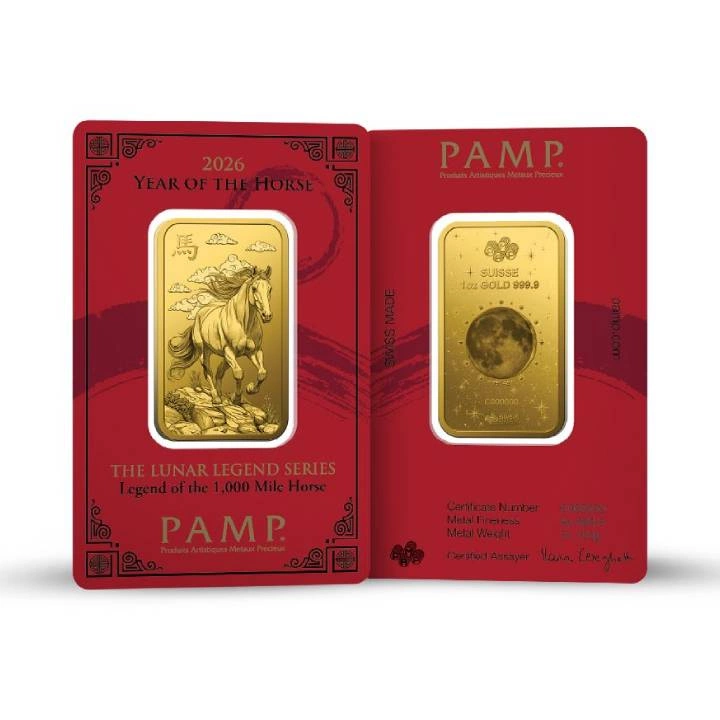 Lunar Legends 1000 Mile Horse 1 unce zlata je exkluzivní sběratelská edice k Roku koně 2026 ze série „Lunar Legend Series“. Tento mimořádně detailně provedený zlatý slitek o hmotnosti 1 unce je vyroben z ryzího zlata o čistotě 999,9 a vzdává hold legendě tisícimílového koně – mytickému zvířeti z čínské kultury symbolizujícímu výjimečnou sílu, vytrvalost a talent. Náklad je limitovaný, každý kus je uložen v ozdobném balení s číslem certifikátu, potvrzujícím pravost a čistotu kovu. Produkt je oficiálně zajištěn švýcarskou rafinerií PAMP SA a je určen pro sběratele, investory i milovníky asijské kultury.