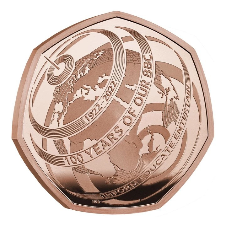 Na reverzu mince je vyobrazen vysílací signál, který do světa vysílá britská BBC. Na reverzní straně se navíc nachází nápisy „1922-2022“, „100 YEARS OF OUR BBC“, „INFORM EDUCATE ENTERTAIN“. Reverzní stranu navrhl Henry Gray.