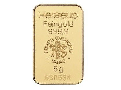 Zlatý slitek 5 g Heraeus – náhodný výběr je klasický investiční produkt vyrobený ze zlata nejvyšší ryzosti, pocházející od jedné z nejznámějších rafinerií drahých kovů na světě. Každý slitek má hmotnost 5 g a na lícní straně vyražené označení ryzosti, výrobce a hmotnosti, což představuje základní potvrzení pravosti kovu. Viditelná značka rafinerie a charakteristická puncovní značka umožňují rychlou identifikaci produktu jak v maloobchodě, tak i na sekundárním trhu.