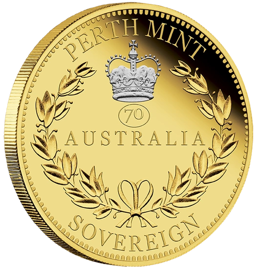 V rubové straně je zobrazena koruna, číslo 70 a nápis „AUSTRALIA SOVEREIGN“, „PERTH MINT“.