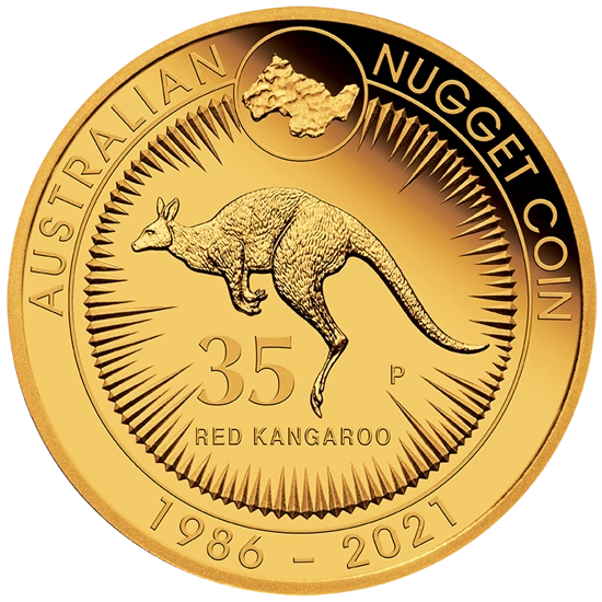 Australský klokan: 35. výročí Kangaroo Nugget 2 unce zlata 2021 Proof