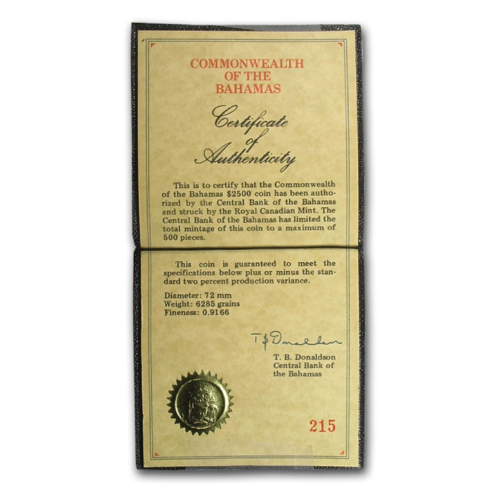 Tento mimořádný produkt navíc vyrobila Královská kanadská mincovna. Mince je garantována vládou Bahamských ostrovů, pokud jde o její legálnost, ryzost slitku a původ kovu, a je plně zákonným platidlem ve vydávající zemi.