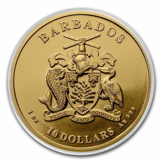 Awers złotej monety przedstawia herb Barbadosu wraz z informacją o wadze, próbie kruszcu i wartości nominalnej.