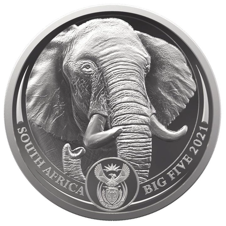 Na lícní straně je zobrazena hlava slona afrického a nápis „SOUTH AFRICA“, „BIG FIVE 2021“ a znak Jihoafrické republiky.