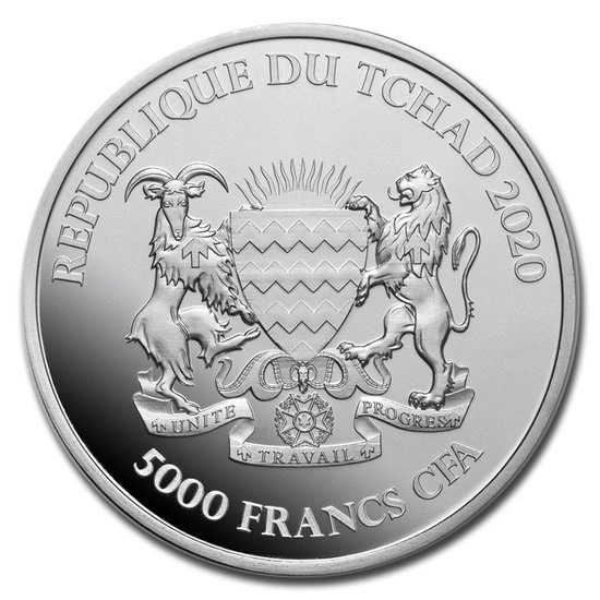 Avers stříbrné mince zobrazuje erb Čadu a informaci o roce vydání a nominální hodnotě mince.