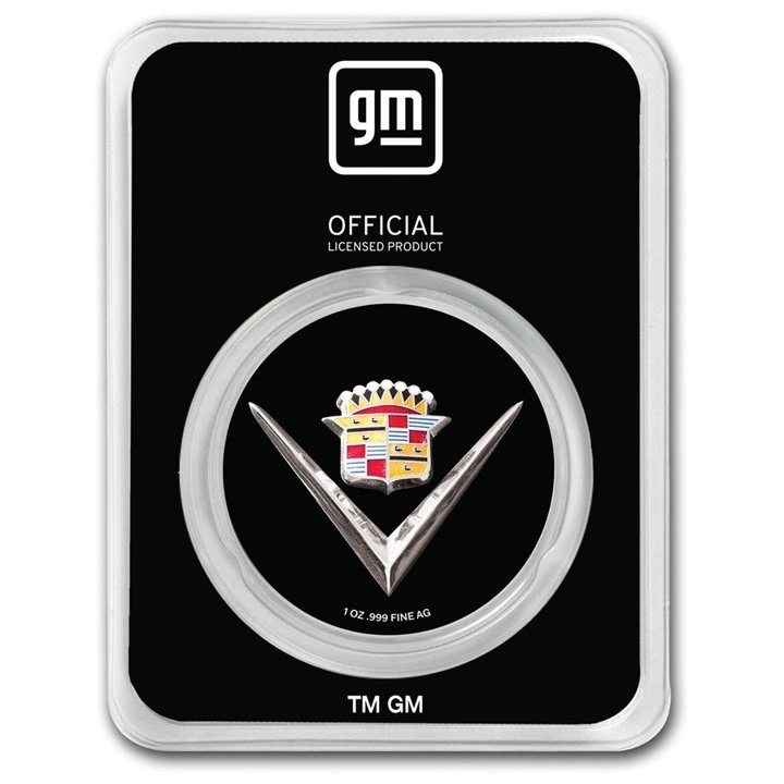 Na Overtu ve střední části mince je zobrazeno barevné logo značky Cadillac. Na averzní straně se rovněž nachází informace o hmotnosti a ryzosti slitku.