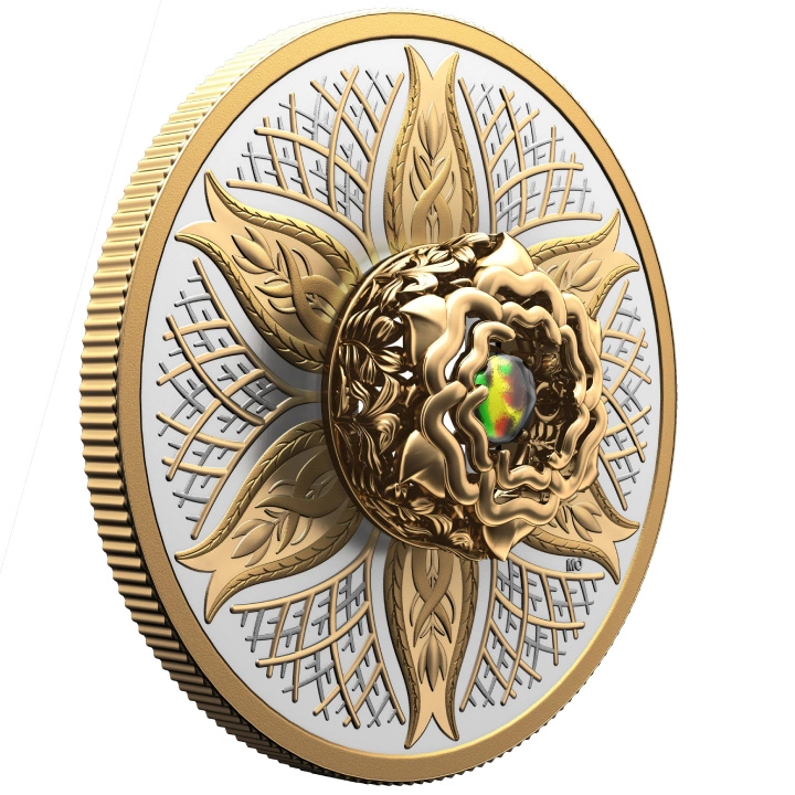 Kanada: Dancing Ammolite - Elements of Nature "Earth" Pozlacený $20 Stříbro 2025 Proof je druhá mince ze série "Dancing Ammolite", která pokračuje v oslavě základních živlů přírody. Edice pro rok 2025 se zaměřuje na prvek, který nás udržuje a živí – Zemi. Motiv kvetení v designu symbolizuje cyklickou obnovu přírody, zatímco okolní větve a kořeny vyjadřují trvalý růst a stabilitu.