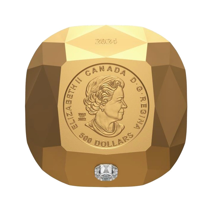Kanada: De Beers Ideal Cut Cushion Diamond $500 Gold 2024 Shaped Matte Proof Coin je další úžasnou sběratelskou mincí z limitované edice. Je na ní vyobrazen 0,23karátový patentovaný oválný diamant „De Beers Ideal Cut Cushion “, který je zasazen na jedné straně mince.