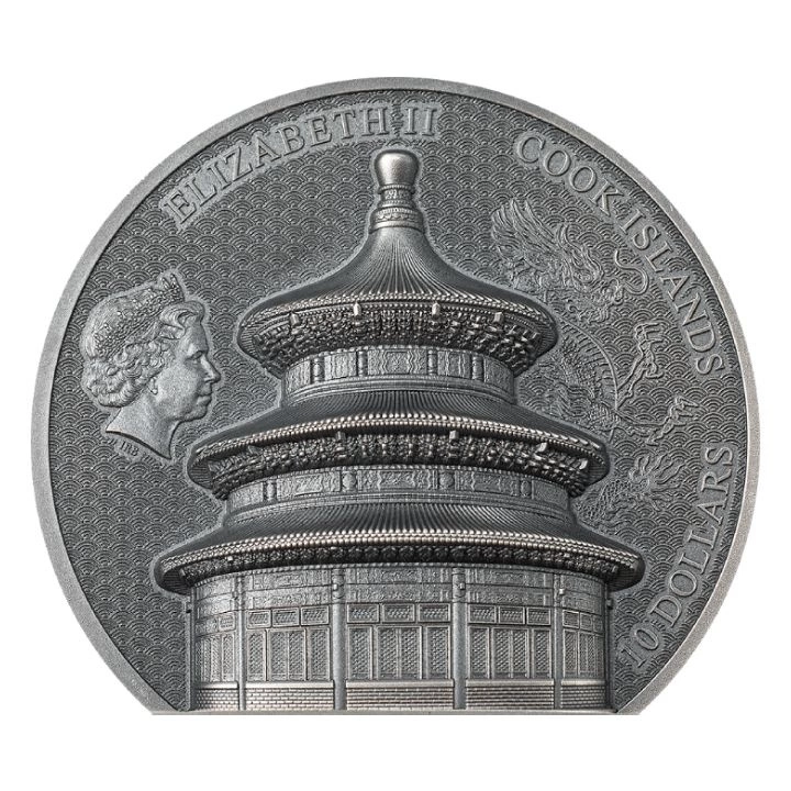 Cookovy ostrovy: Peking – Chrám nebes 2 unce stříbra 2023 Ultra High Relief Antiqued Coin