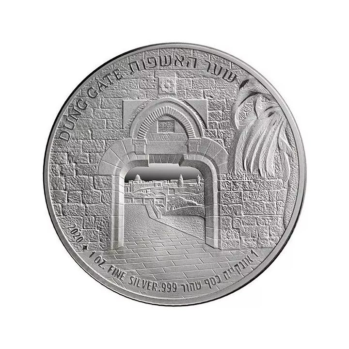 Na averzní straně je zobrazena Dungova brána a nápis „DUNG GATE“. Na averzu jsou informace o letopočtu, ryzosti a hmotnosti slitku napsané hebrejsky, anglicky.