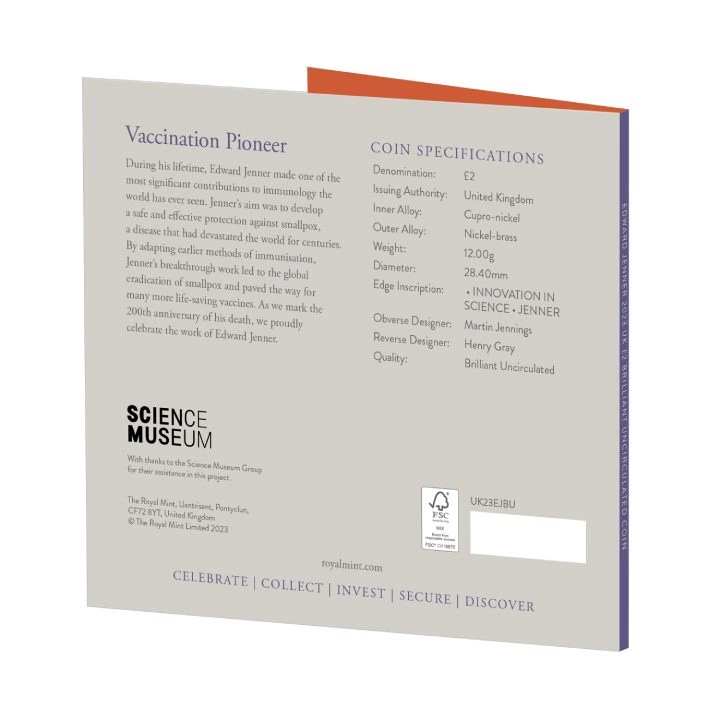 Na reverzu je zobrazeno jádro buňky neštovic obklopené ikonami představujícími lidi a nápisy „EDWARD JENNER“, „A VACCINE TO END SMALLPOX“. Za návrh reverzu je zodpovědný Henry Gray.