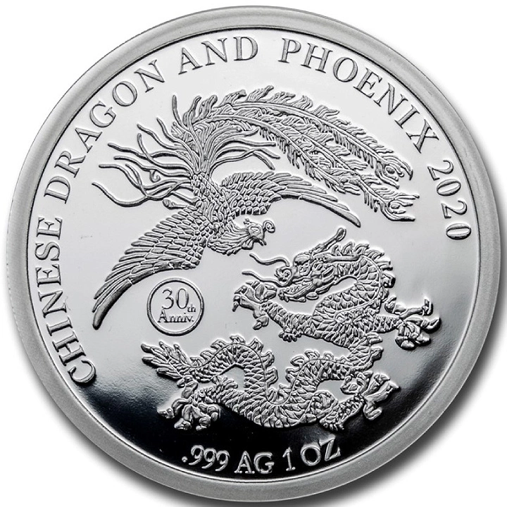 Na reverzní straně jsou zobrazeny obrazy draka a fénixe, jakož i emisní země, rok ražby a ryzost mince.