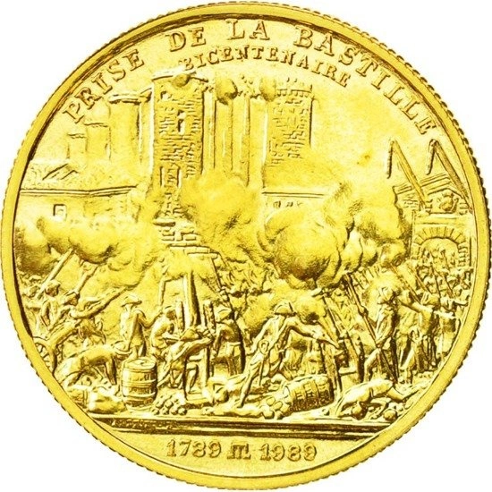 Rewers monety przedstawia scenę przeprowadzanego podczas rewolucji francuskiej szturmu na bastylię.