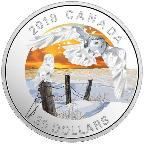 Rewers przedstawia dwa różne style artystyczne.Kolorowy zachód słońca stanowi jedyną nutę ciepła w tej kolorystycznej zimowej scenie, w której niebo płonie pomarańczowymi i żółtymi barwami. Otwarte pole daje poczucie spokoju, gdy krajobraz spoczywa pod pokrywą śnieżną. Jedyny ruch pochodzi od dwóch enigmatycznych śnieżnych sów, składających się z wielokątów. Rozpostarte skrzydła sowy stwarzają iluzję ruchu, pozornie "rozbija" to granice obrazu i jego geometryczną formę, płynnie przechodząc od abstrakcji do realizmu. Słowo "KANADA", wartość nominalna "20 DOLLARS" i rok "2018" są wygrawerowane wzdłuż obręczy rewersu.