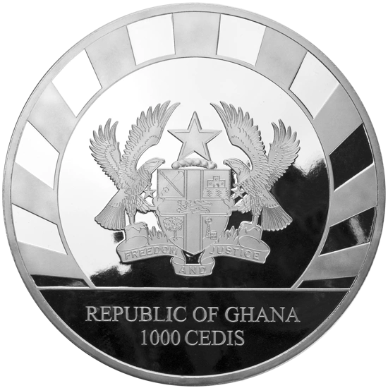 Awers srebrnej monety przedstawia herb Ghany oraz napis „ Republic of Ghana” i informacje o wartości nominalnej.