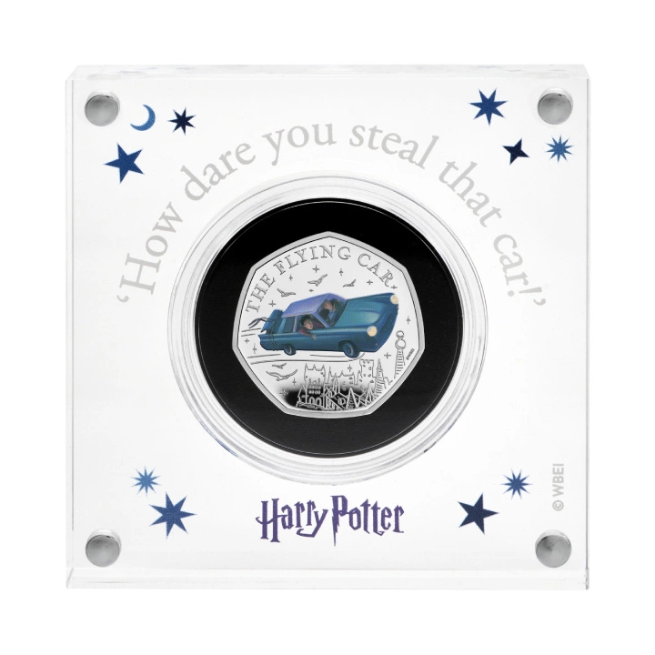 Harry Potter: The Flying Car Barevná 50p Stříbro 2025 Proof připomíná jedno z nejikoničtějších událostí ze druhého ročníku Harryho Pottera na Škole čar a kouzel v Bradavicích. Zobrazuje okamžik, kdy se mladý čaroděj spolu se svým přítelem Ronem Weasleym, poté co bylo uzavřeno přechod na nástupiště Devět a Tři Čtvrtě, rozhodne vydat na neobvyklou cestu v začarovaném Fordu Anglia, aby se dostal do školy.