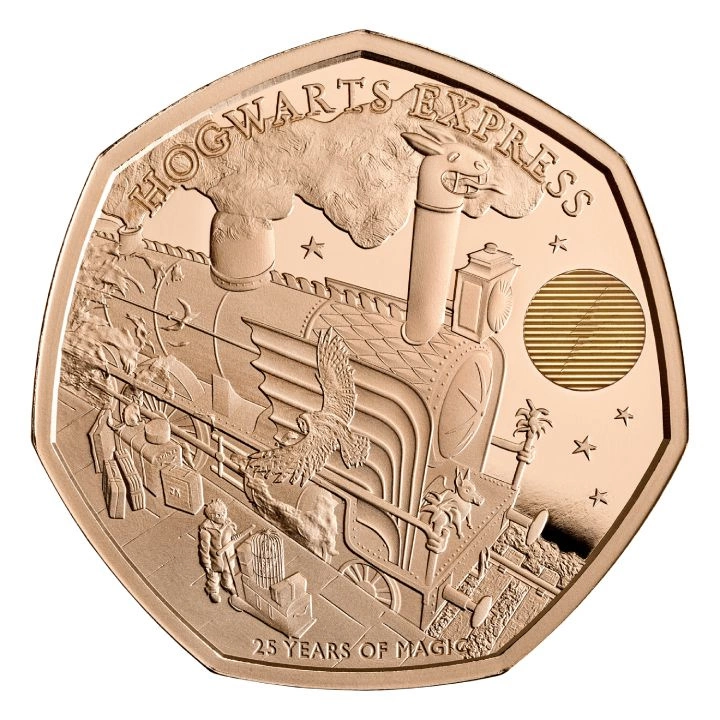 Na rubové straně mince je zobrazen vlak a nápisy „HOGWARTS EXPRESS“ a „25 YEARS OF MAGIC“. Autorkou návrhu reverzní strany je Ffion Gwillim.