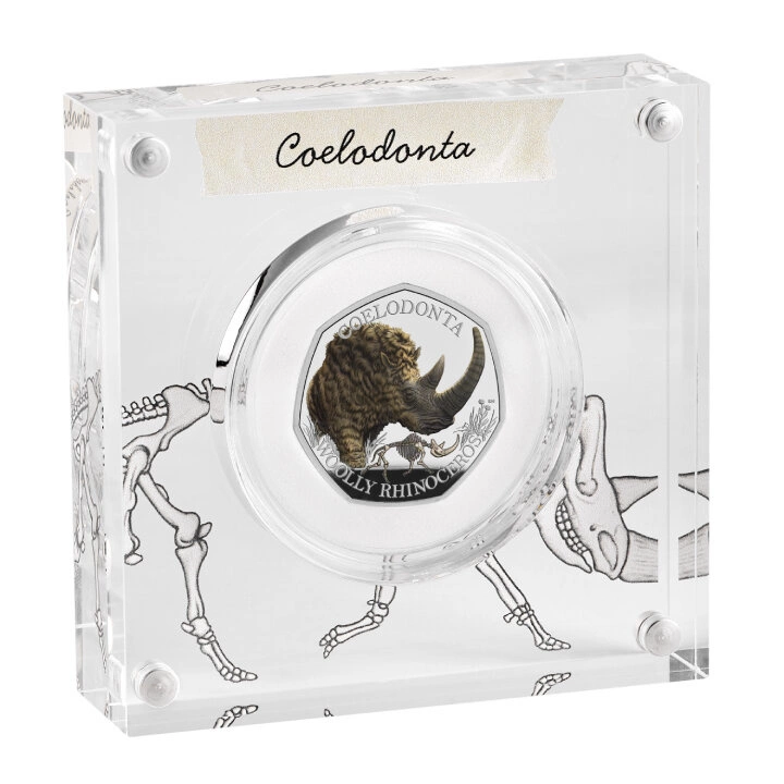 Ice Age Giants - Woolly Rhinoceros Coloured 50p Silver 2024 Proof je další mincí ze série 'Ice Age Giants', která oslavuje jedinečné tvory z období pleistocénu. Nosorožec srstnatý (Coelodonta antiquitatis) byl jedním z nejvýraznějších velkých savců obývajících Eurasii v době ledové. Toto zvíře se díky husté srsti a mohutné stavbě těla přizpůsobilo drsným zimním podmínkám.