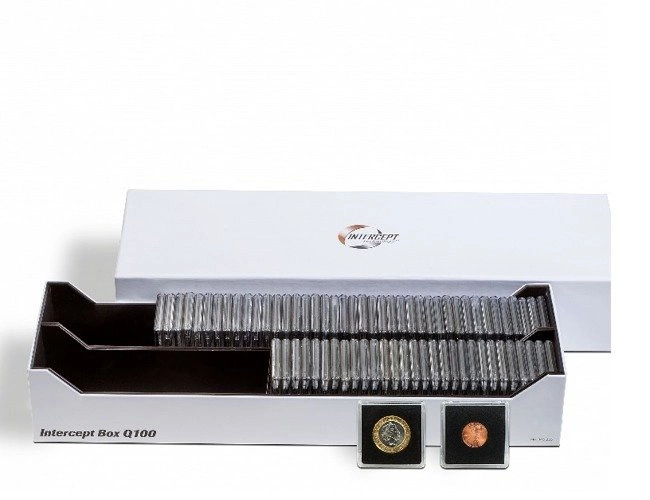 Skrzynka Intercept Box na 100 kapsli Quadrum posiada wnętrze wyłożone materiałem Intercept, by aktywnie chronić Państwa monety przed oksydacją. Mieści 100 kapsuł na monety Quadrum, lub około 300 holderów (50 mm X 50 mm). Nadaje się do przechowywania monet i medali z miedzi, złota, srebra, mosiądzu i innych. Wymiar zewnętrzny: 370 x 64 x 125 mm. Sposób działania skrzynki Intercept bazuje na opatentowanej ponad 30 lat temu technologii : cząsteczki miedzi zawarte w materiale  na stałe wiążą się z korozyjnymi gazami i w bardzo krótkim czasie wytwarzają neutralną atmosferę, która chroni monety i dokumenty przed nalotem (gwarantowana ochrona nawet przez 15 lat). Skuteczność metody została potwierdzona licznymi uznanymi normami DIN, EN, ISO oraz ASTM. Aby wydłużyć skuteczność działania skrzynki Intercept ponad 15 lat, należy skrzynkę zamknąć niezwłocznie po użyciu i unikać jej otwierania.