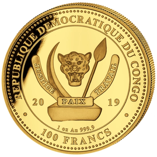 Awers złotej monety przedstawia herb Republiki Konga oraz informacja o roku wybicia, wartości nominalnej, wadzę oraz próbie użytego kruszcu.