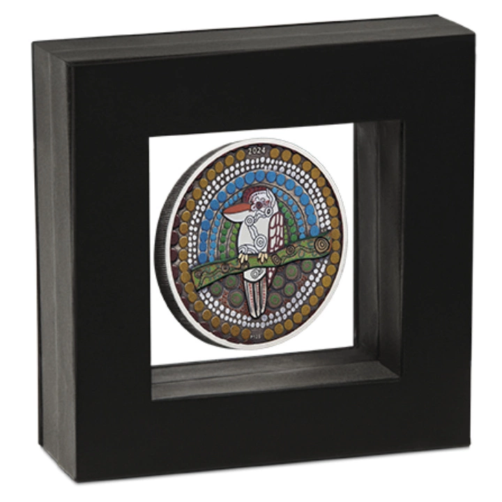 Na sběratelské minci Kookaburra Kaa-Kaa Coloured 2 oz Silver 2024 Antiqued Coin je vyobrazen klokan inspirovaný kulturou domorodců. Vzorník navrhl výtvarník Kevin Bynder, který pochází z kmene Whadjuk-Yuet-Ballardong.
