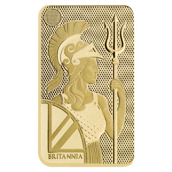 Zlatý slitek Britannia 5 g je výjimečná investiční nabídka renomovaného výrobce drahých kovů, The Royal Mint. Tento slitek zobrazuje moderní interpretaci Britannia od Jodyho Clarka, symbolizující sílu a ochranu. Britannia je znázorněna v korintském helmu, držící trojzubec a štít ozdobený vlajkou Spojeného království.