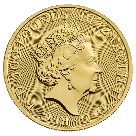 Na awersie uwieczniono portret Królowej Elżbiety II w koronie oraz nominał monety (£100).