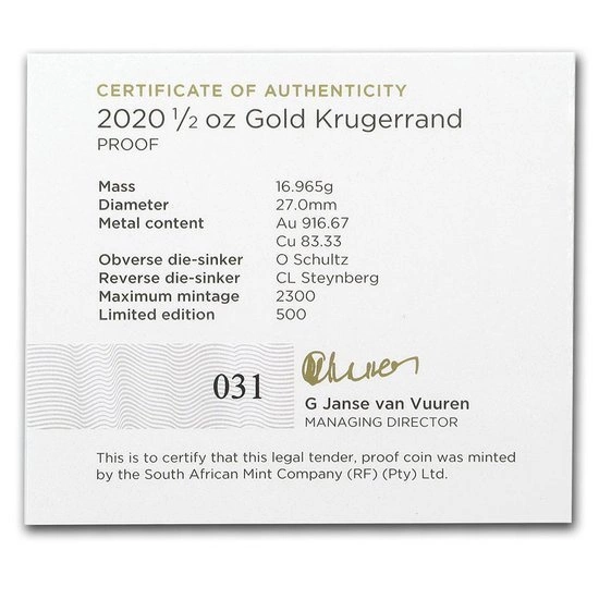 Rewers przedstawia antylopę springbok, symbol Południowej Afryki. Po jej obydwu stronach znajdują się liczby reprezentujące rok wybicia, pod spodem widnieje napis „Fyngoud 1/2oz fine gold”, wskazujący zawartość czystego złota.