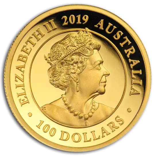 Awers złotej monety przedstawia wizerunek królowej Wielkiej Brytanii Elżbiety II wraz z rokiem, nominałem oraz krajem bicia monety.