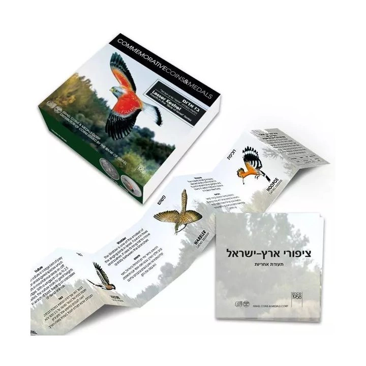Na lícní straně je zobrazena barevná poštolka letící nad hlavou a nápis „BIRDS OF ISRAEL“. Na averzu jsou informace o letopočtu, ryzosti a hmotnosti slitku napsané v hebrejštině, angličtině a logo „The Holy Land Mint“.