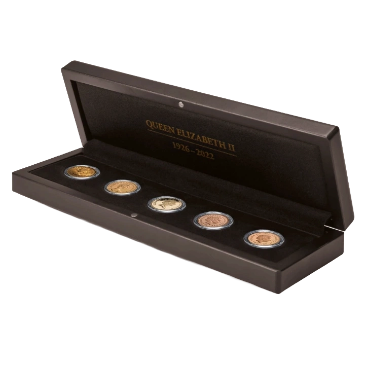 Na víku a na vnitřní straně pouzdra je vyobrazen zlatý nápis „QUEEN ELIZABETH II 1926-2022“ a obě averzní strany zlaté mince Sovereign. Vnitřek pouzdra je vyložen černým sametem a má magnetický uzávěr. Výrobcem pouzdra je společnost Leuchtturm.