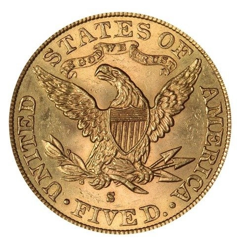 Rewers zawiera wizerunek heraldycznego orła z tarczą na piersi. Powyżej widnieje napis "IN GOD WE TRUST". W okół całości rozciąga się napis "UNITED STATES OF AMERICA" oraz nominał monety " FIVE D."