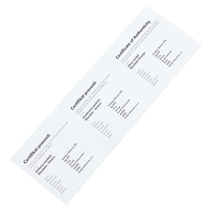 Mandala Change Coloured Silver 2022 Proof je devátou medailí ze série „The Gift Series“ a dobře poslouží jako dárek pro každou příležitost. Na výrobku je vyobrazena mandala s motivem „změny“. Mandaly mají podobu kruhového obrazce se středem a zobrazují symetricky uspořádané tvary.