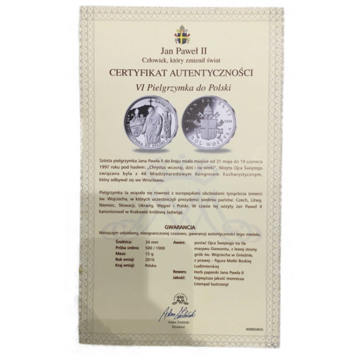 Medaile Jan Pavel II - VI. Poutní cesta do Polska 31.5-10.6.1997 je jedinečný kus, který připomíná šestou poutní cestu papeže Jana Pavla II. do Polska, která probíhla od 31. května do 10. června 1997. Byla to důležitá chvíle v historii Církve i Polska, která spojila miliony věřících v oslavách duchovního setkání s papežem. Tato medaile je památkou na tento výjimečný okamžik, který měl velký význam pro Polsko i celou katolickou církev.