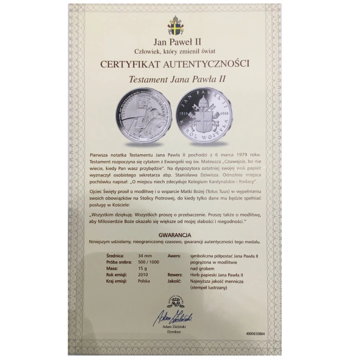 Medaile Testament Jana Pavla II. je výjimečný sběratelský kousek, který připomíná mimořádné dědictví polského papeže a jeho poslední vůli, kterou předal světu. Tato medaile je součástí série věnované památce Jana Pavla II., muže, který měl trvalý vliv na katolickou církev a celý svět.