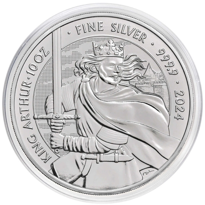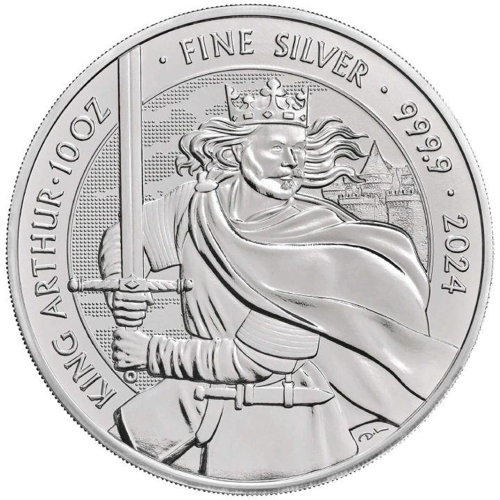Stříbrná mince Mýty a legendy: Král Artuš 10 oz 2024 zobrazuje vládce historické Británie krále Artuše, hrdinu nesčetných legend, literárních děl a filmů. Je známý mimo jiné díky svému slavnému dílu „Rytíři kulatého stolu“.