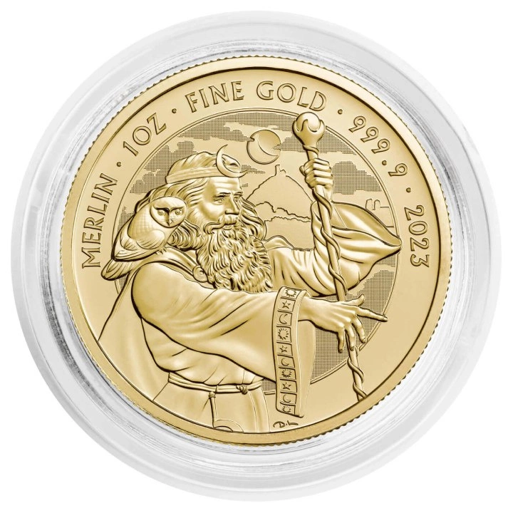 Zlatá mince Mýty a legendy: Merlin 1 oz Gold 2023 představuje jednoho z hrdinů artušovských legend, nesčetných pověstí, literárních děl a filmů. Je známý mimo jiné ze slavného díla „Rytíři kulatého stolu“.