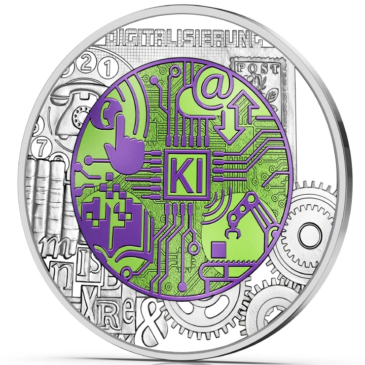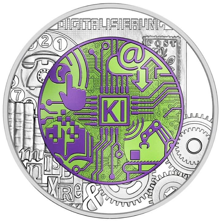 Revers ukazuje analogové předměty, jako je poštovní známka, knihy a telefonní číselník na stříbrném prstenci. V niobovém jádru jsou jejich digitální protějšky: cloud, pixelová ikona knihy a průmyslový robot. Uprostřed se nacházejí písmena "KI" (německý ekvivalent AI) umístěná na mikroprocesoru, symbolizující propojení všech prvků.