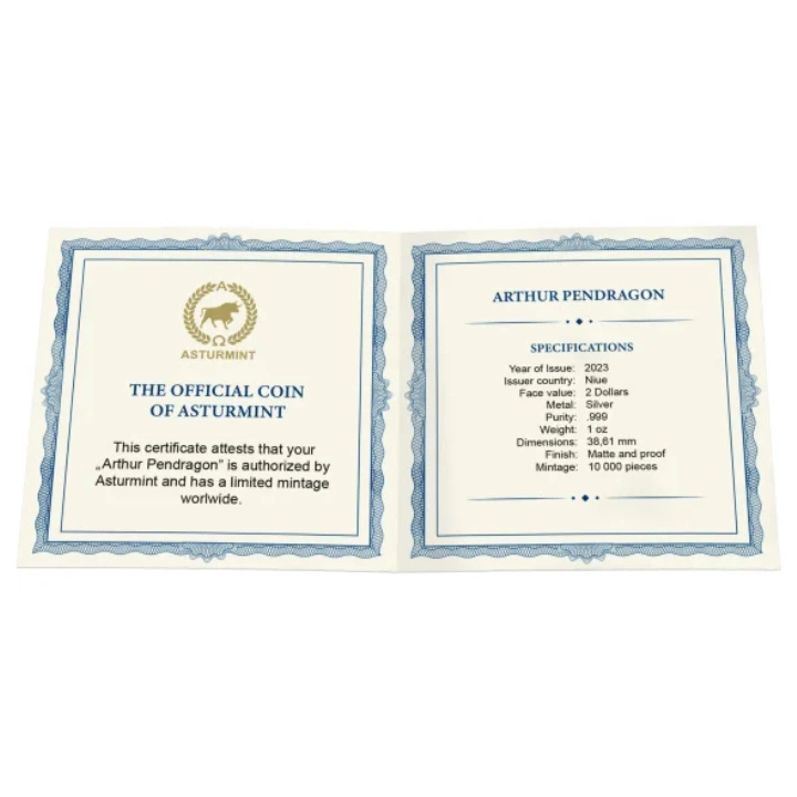 Stříbrná mince Niue: Camelot - Arthur Pendragon 1 oz Silver 2023 Matte Proof je první mincí ze série „Camelot“. Legenda o Artušovi je jedním z nejznámějších rytířských a mytologických příběhů spojených s britskou historií. Je to příběh mladého krále, který měl být vyvolen, aby naplnil svůj osud jako obránce své země proti jejím nepřátelům.
