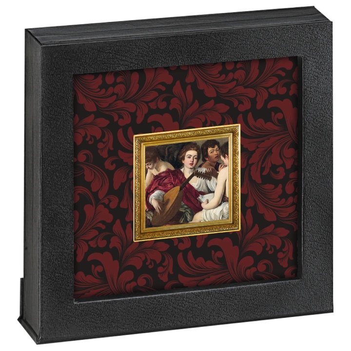 Niue: Caravaggio - koncertní kolorovaná pozlacená mince o hmotnosti 1 oz Silver 2022 Proof je mincí připomínající Michelangela Merisiho da Caravaggio a jeho 450. výročí narození. Na exempláři je vyobrazen umělcův obraz, který je portrétem tří mladých mužů zaneprázdněných koncertováním. Doprovázejí je noty a strunné nástroje.