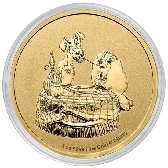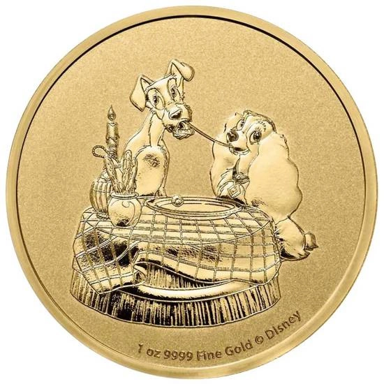 Averz reverz zlaté mince zdobí vyobrazení postav z filmu Lady a Tramp, jak jedí těstoviny. Z rubové strany lze rovněž vyčíst hmotnost, označení bullion proof a logo Disney.